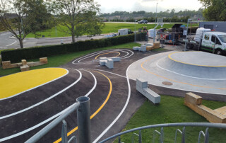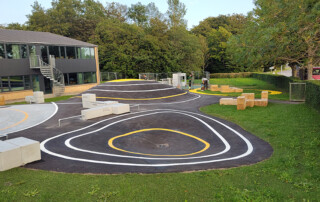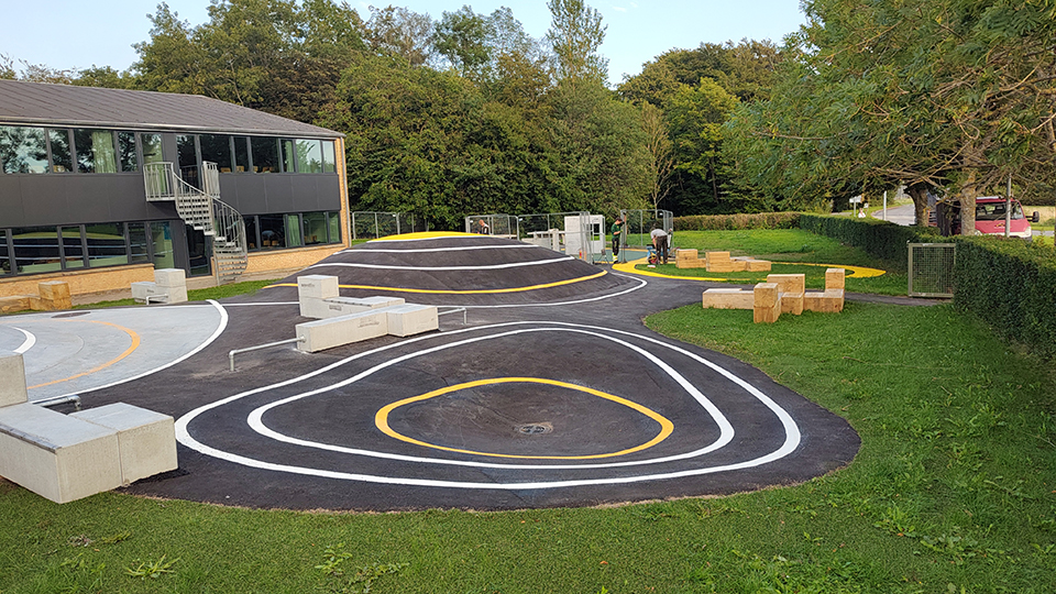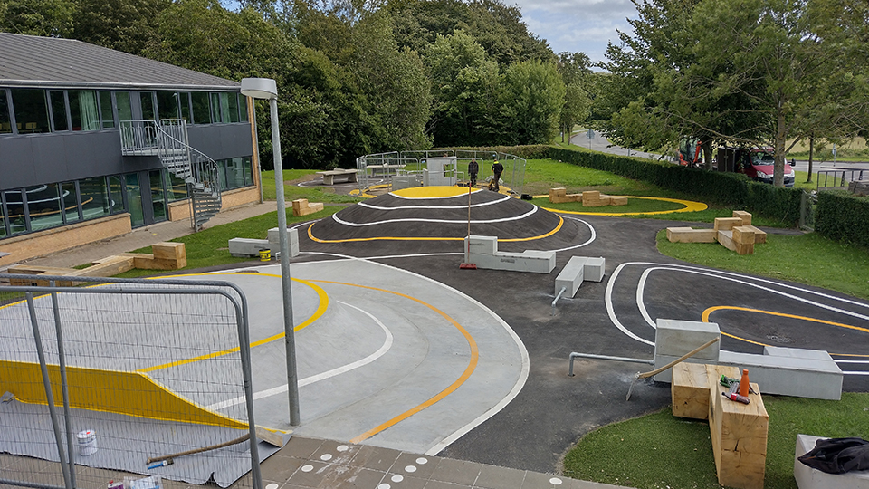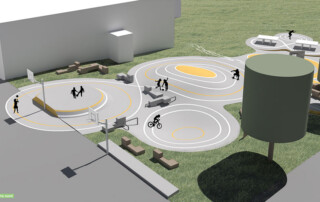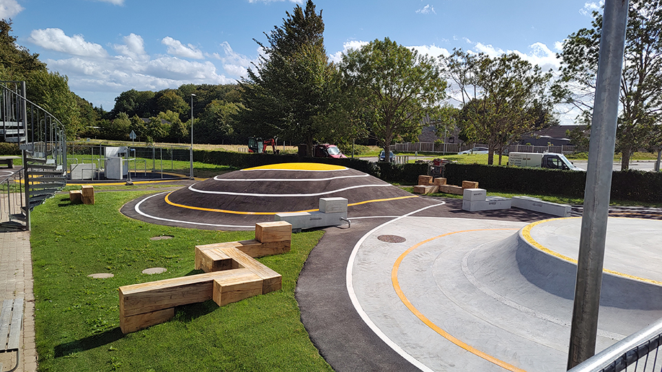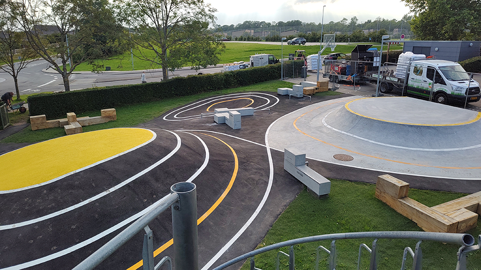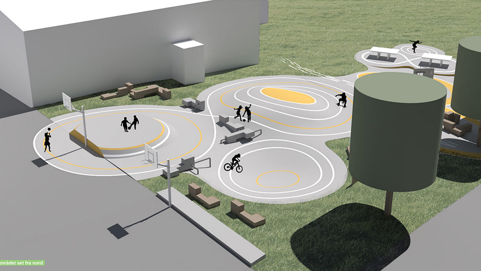 Nyt aktivitetsområde med skateramper, parkour, bordtennis og en række lækre opholdsmøbler designet af MBYland. Nu kan børn og voksne motionere på skateboard, løbehjul og cykler, lave parkour og slappe af på møblerne. Jord flyttes internt for at minimere ressourceforbrug. Bakker belagt med asfalt og dekorativ gule striber. Flotte egetræsmøbler (350×350 mm) står på hybridgræs for at beskytte plænen.